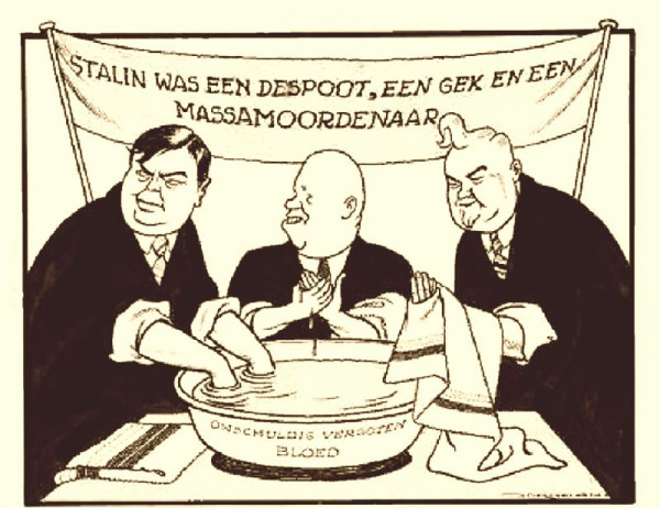 ...В лозунге над головами Хрущёва, Маленкова и Булганина написано (см. фото-картинку) «Сталин был деспотом, безумцем и массовым убийцей», а на тазике, в котором они отмывают руки – «Невинно пролитая кровь». Такова карикатура в Нидерландах на антисталинский, якобы «закрытый» доклад Хрущёва на ХХ съезде КПСС 25 февраля 1956 г., решение о выступлении с ним Хрущева было принято президиумом ЦК 15 февраля.