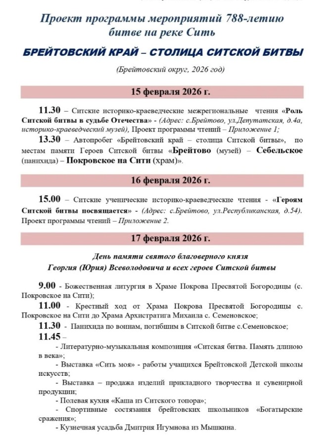 В 2026 году программа мероприятий в Брейтовском районе рассчитана на 3 дня: исторические чтения, автопробег, ученические чтения, богослужение, крестный ход, спортивные состязания, концертная программа, сообщает наш корреспондент.