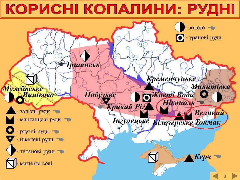 Ресурсная карта Украины, 2014 г. - тёмно-бежевый цвет и красные окружности - сосредоточение редкоземельных и других наиболее ценных ископаемых ресурсов