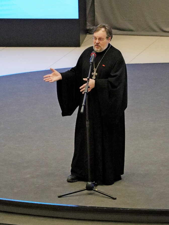 Председатель ОВЦО Санкт-Петербургской епархии протоиерей Александр Пелин перед началом мероприятия прочёл молитву и остановился на ключевых моментах, которые поднимает данный фильм: