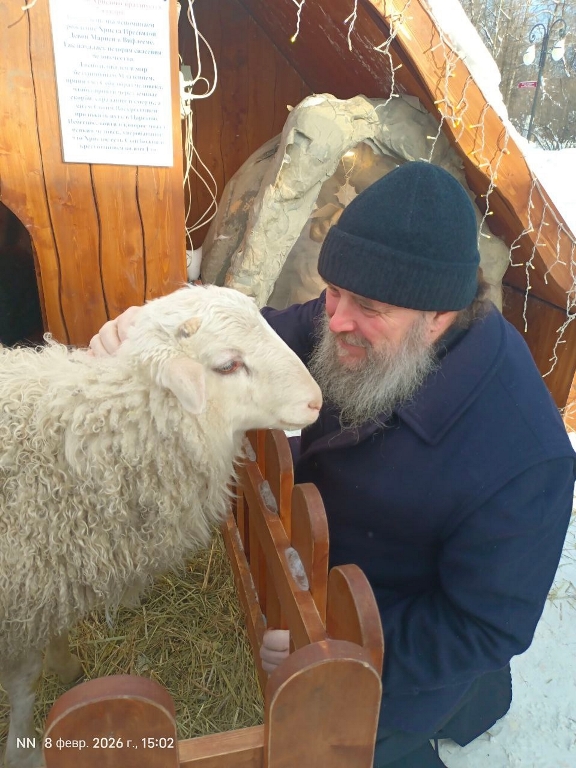Всех прихожан у входа в храм встречает живая овечка. Здесь я почувствовал себя пастырем!