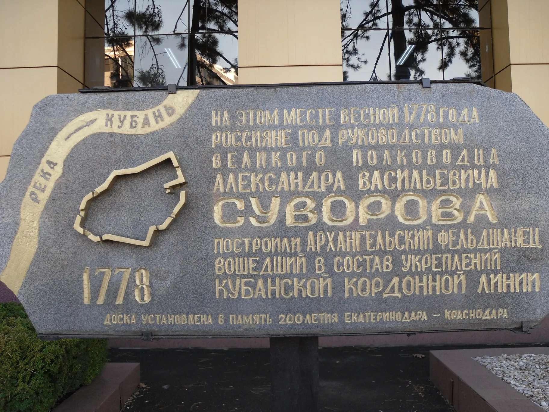Миф третий: «Нет прямого указания Суворова строить город именно в Карасунском Куте». Есть не только косвенные, но и прямые стратегические указания. В «Плане войны против Турции», продиктованном Суворовым инженер-полковнику де-Волану 10 ноября 1792 года, читаем: «...его капиталъ находился в Копыле, в центральном пункте, местности нездоровой (можно было бы его перенести в лучшую, не слишком удаляясь) и на реке Кубани...» [6]. Это прямое предписание перенести главный штаб (капитал) из Копыла в более здоровое место вверх по Кубани. А что такое «не слишком удаляясь вверх по Кубани»? Это именно зона Архангельского фельдшанца — Карасунский Кут. Суворов задолго до казаков определил оптимальное место для административного центра.