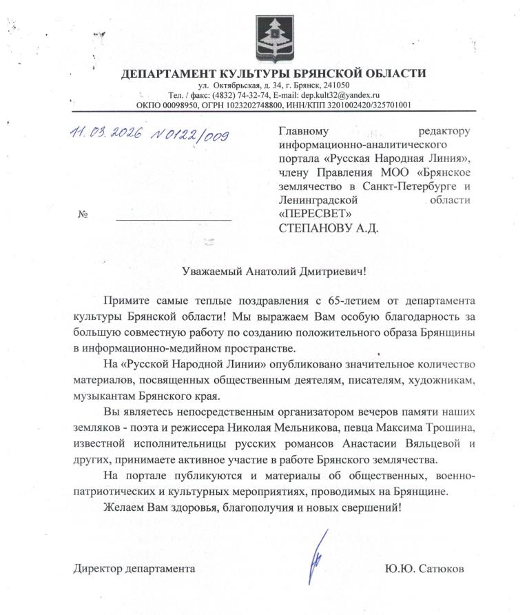 Для Брянского землячества «Русская Народная Линия» стала (помимо сайта землячества) основной информационной площадкой, где сообщается и о наших делах и о наиболее значимых общественно-культурных мероприятиях на Брянщине. За большую работу по созданию положительного имиджа нашей малой Родины Анатолий Дмитриевич неоднократно отмечался наградами Губернатора Брянской области, департамента культуры, правления землячества. Я не беру на себя смелость написать полный портрет моего друга и земляка. Думаю, этот портрет допишут его многочисленные соратники. Я коснулся только одной грани деятельности юбиляра и многочисленных талантов, которыми сполна наделил его Господь.