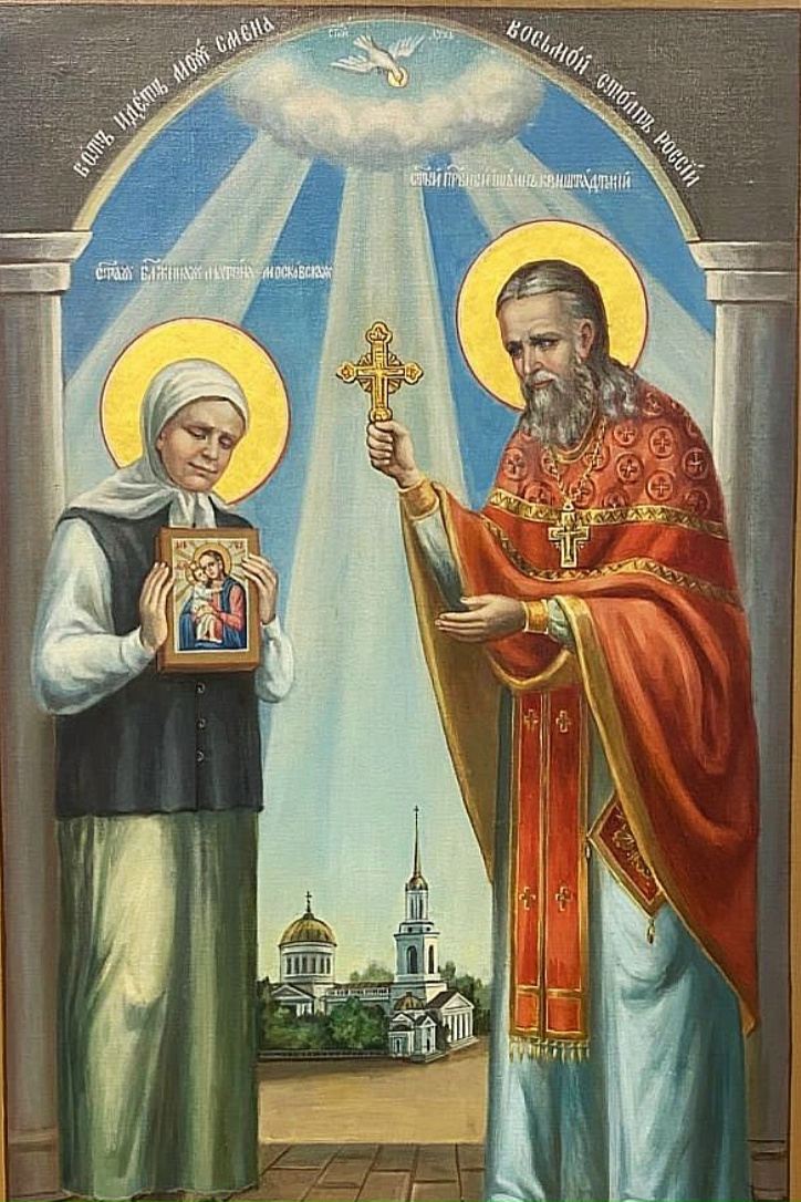 Для нас большая радость, что блаженная Матрона духовно связана с Кронштадтом. По причине своего недуга Матрона не могла ездить по монастырям, градам и весям Русской земли. В своей земной жизни она побывала всего лишь в нескольких места – Себино, Москва, Кронштадт, кроме это упоминаются две лавры – Киево-Печерская и Троице-Сергиева. Себино – малая родина, село на Тульской земле, где родилась подвижница. Москва – место её многолетнего старческого и исповеднического подвига. А Кронштадт можно назвать духовной родиной Матроны, ибо именно здесь она получила благословение Всероссийского пастыря на служение и миссию быть духовным столпом России. По преданию, по окончании службы в Андреевском соборе отец Иоанн Кронштадтский попросил прихожан расступиться перед подходящей к солее Матроной и громко сказал: «Матронушка, иди ко мне. Вот идёт моя смена — восьмой столп России!»