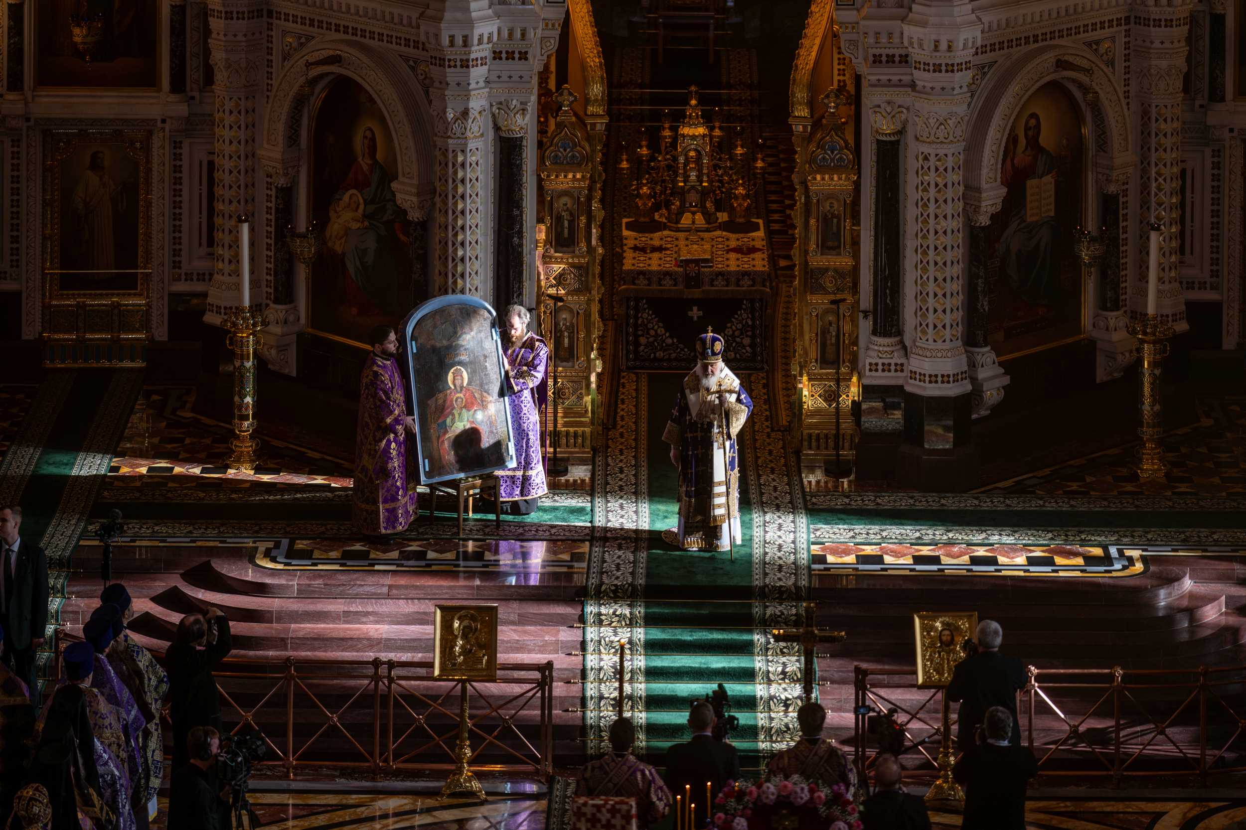 Перед началом богослужения из алтаря на амвон была вынесена чудотворная икона Божией Матери «Державная», ранее находившаяся на реставрации. Святейший Патриарх Кирилл обратился к верующим с Первосвятительским словом, посвященным этому образу: