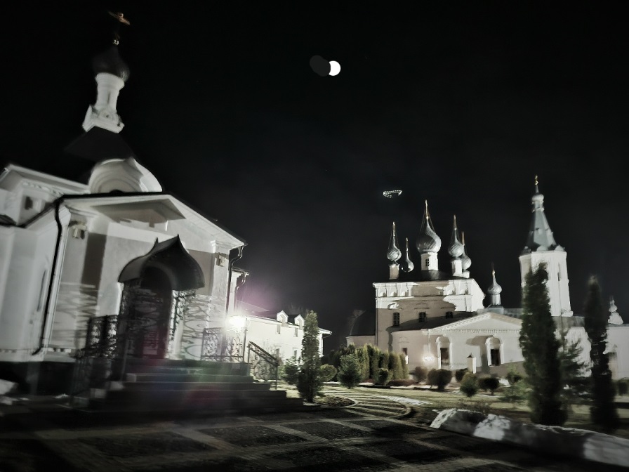 Я шёл один по большой площади для стоянки автотранспорта и не верил глазам, неужели это то самое Годеново. Белый храм сиял в лучах подсветки и его золотые кресты как будто отражали свет ночных звезд.