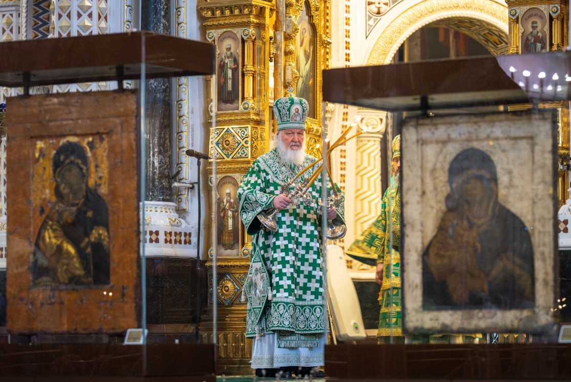 По прибытии в Храм Христа Спасителя перед началом богослужения Предстоятель Русской Православной Церкви поклонился чудотворным Владимирской и Донской иконам Божией Матери и честным мощам святителя Филарета, митрополита Московского.