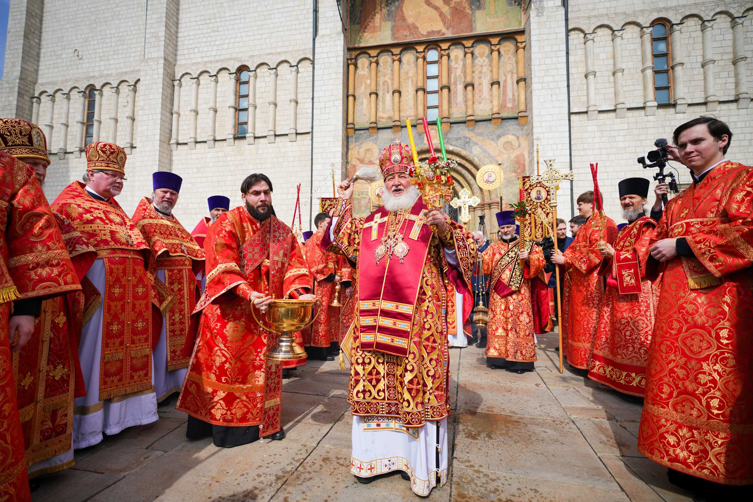 Затем Святейший Патриарх Кирилл возглавил крестный ход вокруг Успенского собора.