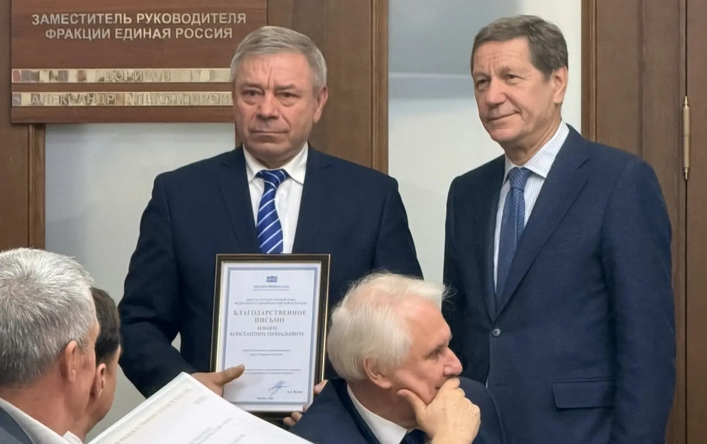 Во время церемонии награждения, где отмечали за активную деятельность представителей муниципалитетов, первый заместитель председателя Государственной Думы РФ Александр Жуков вручил Благодарственное письмо Государственной Думы Ильину К.Г. за значительный вклад в развитие местного самоуправления в Российской Федерации. Глава нашего муниципалитета много лет работает в этой сфере, направляет немало предложений по совершенствованию законодательства о местном самоуправлении, обращений по различным проблемам современности, принятых совместно с депутатами муниципальной думы.