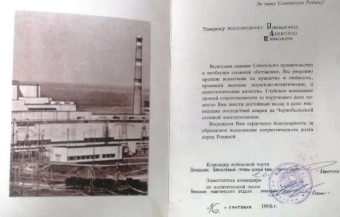 Дважды: в июне и августе 1986 года отец побывал там, где царила невидимая и коварная смерть, но о ней приходилось забыть, т.к. необходимо было выполнять приказ. Как он вспоминает, ему была поставлена задача возвести с нуля автопарк на 800 единиц техники, не обеспечив при этом ничем. Ему пришлось на свой страх и риск по нескольку раз выезжать в покинутый жителями Припять – город атомщиков, и буквально «бомбить», оставленные в панике жителями постройки, разбирая их по кирпичику и бревнышку на строительство будущего автопарка. Если стройматериалы уж слишком сильно фонили, их зарывали в землю, то что фонило по тем меркам терпимо, грузилось на ЗИЛы и КАМАЗы.