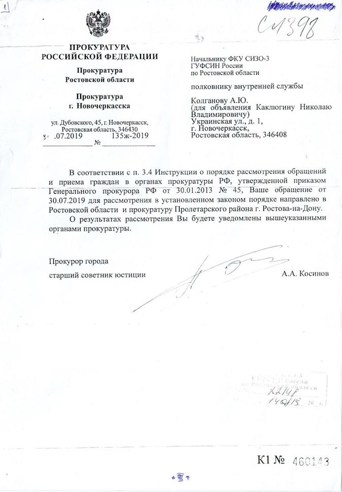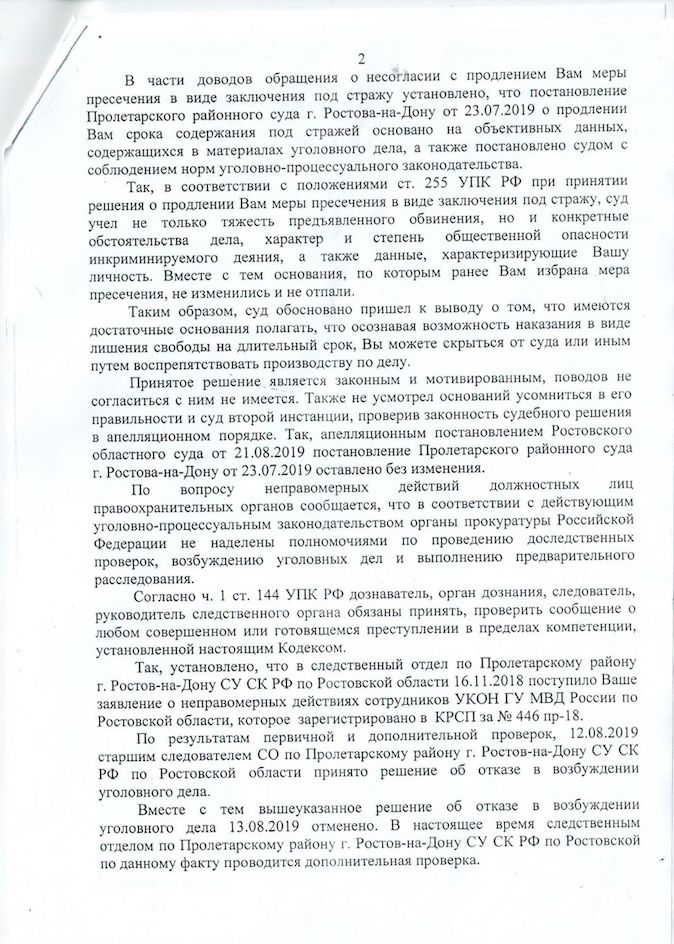 19.03.2019 г. заместитель прокурора г. Новочеркасска А.Ш. Ширинов те моменты, что я отразил в части нарушений УК и УПК РФ следователями Швецовой И.С. и Семыкиным Д.В. в следственных кабинетах СИЗО-3 в январе-феврале 2019 г., перенаправил в г. Ростов-на-Дону, написав мне разъяснение: «Ваше заявление в части незаконных действий следователя по о/в делам ОРП на ТО ОП №7 СУ УМВД России по г. Ростову-на-Дону Швецовой И.С. и руководителя следственного отдела направлено прокуратурой города для рассмотрения по территориальности прокурору Пролетарского района г. Ростова-на-Дону». Ни мне, ни стороне защиты, адвокатам Пешикову П.С. и Евдокимову В.Н., защищающим мои интересы, ничего не известно об итогах прокурорской проверки по данному заявлению. Считать ответом на него отписку за подписью С.Ю. Касянчука, и.о. заместителя районного прокурора от 27.03.2019 г. (см. Приложение 8 на 3 листах) или ближайшую по дате, от 03.04.2019 г. (см. стр. 13-15 Приложения 5), отвечающую, что вообще уникально по степени незаконности, сразу на два моих обращения, абсолютно разных по сути, смыслу и содержанию жалоб, от 19.03. и 01.04.2019 г., естественно, невозможно. То, что к уголовной ответственности сразу минимум за две статьи Уголовного кодекса РФ: «Халатность» и «Превышение должностных полномочий», должны быть привлечены С.С. Чабров и С.Ю. Касянчук со стороны прокурорских работников, помимо всех прочих преступников по моему делу из числа должностных лиц, у моих коллег, соратников, стороны защиты, близких и родных, меня самого сомнений давно не вызывает. Посмотрим на реакцию областной прокуратуры, инициированную прокурором г. Новочеркасска А.А. Косиновым по итогам моего обращения в той его части, где о них прописано.