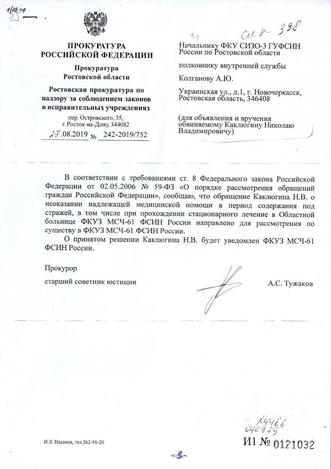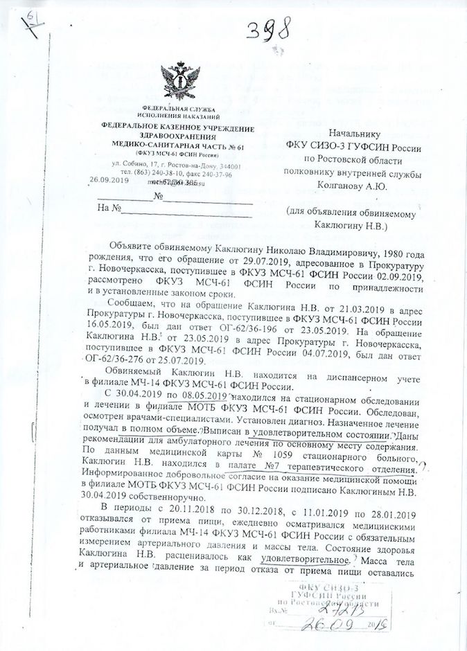 6. Перед самой передачей данного материала для публикации, 30.09.2019 г. вручена очередная отписка за подписью начальника ФКУЗ МСЧ-61 ФСИН России А.С. Пачганова, содержащая абсолютно лживую информацию по всем пунктам, включая отсутствие третей голодовки, и то, что, якобы, с 30.04. по 08.05.2019 г. (не по 16.05.!) я находился в палате №7 терапевтического отделения, а не психоневрологического, как было на самом деле. И снова никакого документального подтверждения фактов нет. Пришло время готовить материалы на директора ФСИН России, а пока эта публикация должна обратить внимание на этот наглый беспредел.