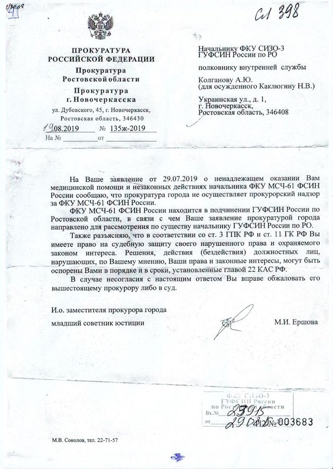 Чтобы ответить на вопросы по медобеспечению меня силами ФКУЗ МСЧ-61 ФСИН России, не хватит не то чтобы одного дня, даже недели. Следовательно, исполнитель данного документа, некто Терновых А.А., указанный в левом нижнем углу этого очень странного ответа от 23.05.2019 г. за подписью подполковника внутренней службы А.С. Пачганова в мой адрес, оказался не готов к полноценному сбору информации на данный блок серьёзных тревожных вопросов, и подал на утверждение своему руководителю абсолютно не соответствующий действительности информационный лист. Тот его подписал. В итоге оба совершили должностное преступление. Слово за прокуратурой и Следственным комитетом Российской Федерации. Тем более я точно знаю как всё происходило на самом деле. Их задача – подтвердить это или опровергнуть. Пока обращаюсь через Вас к прокурору г. Новочеркасска А.А. Косинову.