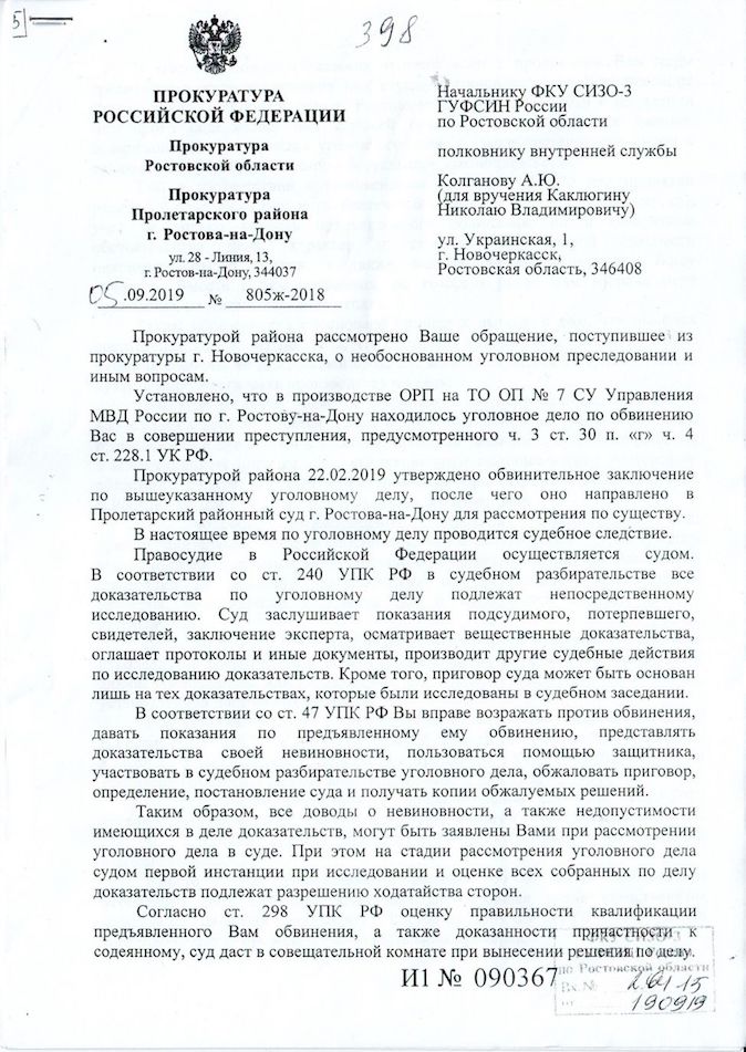 Чувствуя поддержку прокуратуры Ростовской области, многие месяцы старательно закрывающей глаза на многочисленные правонарушения, совершённые следственным отделом ОРП на ТО ОП №7 СУ УМВД России по Ростову-на-Дону во время досудебного расследования моего дела, заместители прокурора Пролетарского района того же областного центра абсолютно спокойно, явно не без ведома самого районного прокурора А.В. Мальцева, штамповали в мой адрес одну за одной отписки, не являющиеся мотивированными ответами по существу на мои и стороны защиты заявления/жалобы/ходатайства. Именно поэтому была ими, С.С. Чабровым и С.Ю. Касянчуком, «узаконена» информация о том, что предъявленное мне следователем И.С. Швецовой 11.01.2019 г. обвинение в совершении преступления, предусмотренного ч. 3 ст. 30 – п. «г» ч. 4 ст. 228.1 УК РФ, легитимно. И их совместная с И.С. Швецовой ложь, что я был успешно допрошен в указанном правовом статусе, и «в ходе допроса вину не признал» (см. Приложение 8 лист 2) была принята и судом Пролетарского района г. Ростова-на-Дону, поскольку обвинительное заключение всё же 22.02.2019 г. было подписано, хоть и с массой нарушений в нём, С.С. Чабровым, заместителем районного прокурора, и передано в суд для судебных разбирательств по существу.