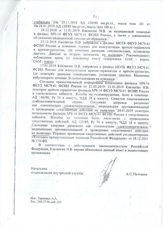 Сразу отмечу, что я ни разу не отказывался от подписи при проведении следственных действий. Только при задержании, боясь, что её подделают в своих целях осатаневшие от своего многолетнего пребывания над законом оперативники 3-го отдела областного УКОН. Всегда в комментариях, заявлениях к документам, экспертизам, протоколам по делу, предъявляемым мне для ознакомления под роспись в моменты плохого самочувствия на это указывал мой защитник-адвокат Пешиков П.С. На что ни разу не посчитала целесообразным опять-таки обратить внимание, нарушая моё право на защиту, и районная, и областная прокуратура. Между тем, следователь Швецова И.С. лично, собственноручно на листе 3 данного протокола меня уже как бы в статусе обвиняемого от 11.01.2019 г., который, по сути то, так и не состоялся, указала следующее: «Обвиняемый Каклюгин Н.В. показал, что…/…/… ждёт врача для оказания помощи. Давление 100/60, состояние плохое, давление измерялось сотрудником медсанчасти. Сильное головокружение, сознание спутанное, показания готов давать позже. Боли в почках, почечная колика, отёки в ногах, нуждаюсь в стационарном лечении. Больше говорить не могу». См. Приложение 13, лист 3 или лист 212 тома 2 материалов моего уголовного дела №11801600095001525. Напомню, что до 30.12.2018 г. я провёл 40 суток только на воде, отказываясь от приёма пищи. 11 дней пытался восстановиться и просил экстренной госпитализации ещё на второй неделе голодовки в МОТБ-19 г. Ростова-на-Дону. 25.12.2018 г. меня этапировали в данное учреждение, но в экстренной госпитализации, как следует не обследовав, мне было отказано. Запись в информационном ответе А.С. Пачганова от 24.04.2019 г. №62/36-159 сообщает детали о том, как возможно еле живого человека на 35-е сутки отказа от приёма пищи отправить выживать обратно в СИЗО, как это обосновать со спокойной совестью: «25.12.2018 г. направлен в филиал ОБ ФКУЗ МСЧ-61 ФСИН России (прим. авт. – ОБ, областная больница, ФК ЛПУ МОТБ-19 ФСИН России), где проведена консультация терапевта, установлен диагноз. 25.12.2018 г. осмотрен урологом, заключение: данных за острую урологическую патологию не выявлено. Рекомендовано: наблюдение врача по основному месту содержания, ОАК – норма, ОАМ – норма». Общий анализ мочи не был в норме – А.С. Пачганов солгал, его подвели составлявшие и эту отписку исполнители документа, тот же А.А. Терновых. При этом, чтобы решить, есть ли урологическая патология, обязательно по стандартам Минздрава России ультразвуковое исследование (УЗИ). Почему оно не было проведено? Где консультация кардиолога? Ведь у меня наблюдались резкие скачки артериального давления со второй половины голодовки! Почему не проконсультировал меня 25.12.2018 г. невролог, ведь у меня осложнён достаточно давно неврологический статус? С какой целью не сделан и не приложен к данному информационному листу биохимический анализ крови, обязательный в данном случае по всем нормативам того же Минздрава РФ?
