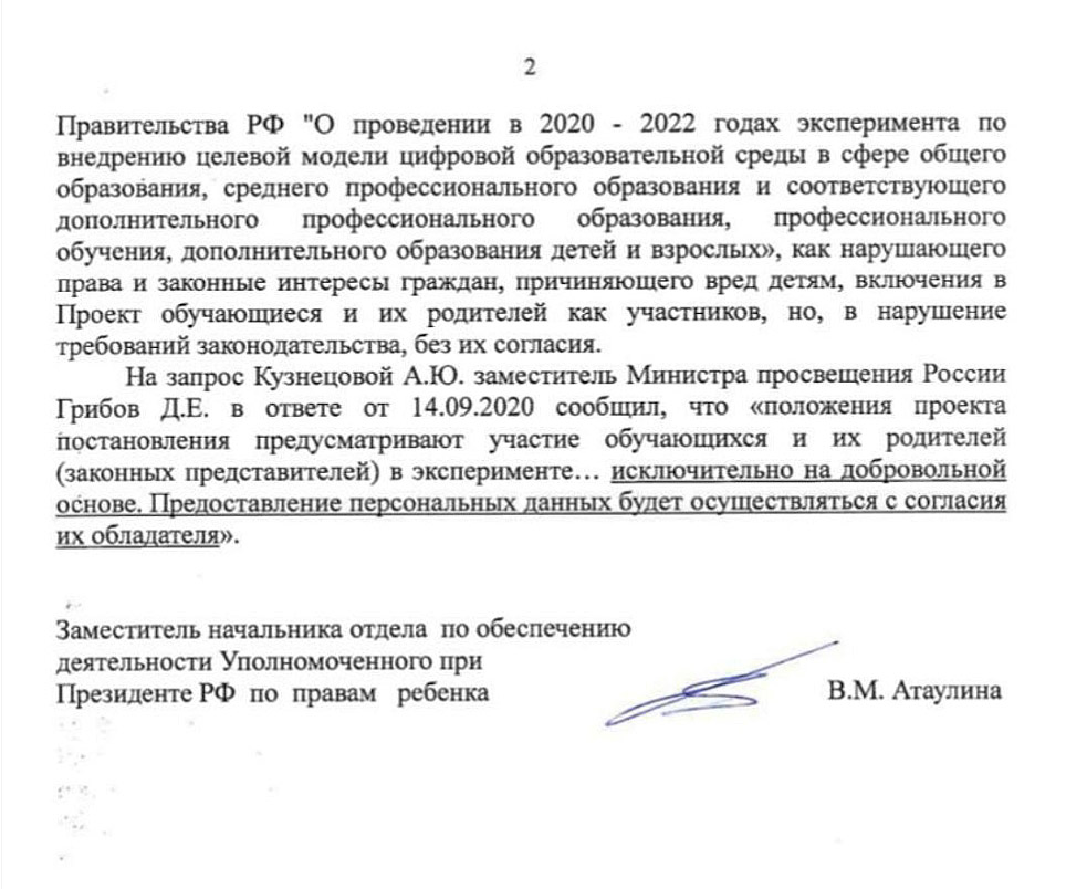 На основании изложенного и действуя в интересах наших детей мы заявляем об отказе от использования всех электронных образовательных платформ в случае внедрения дистанционных образовательных технологий.