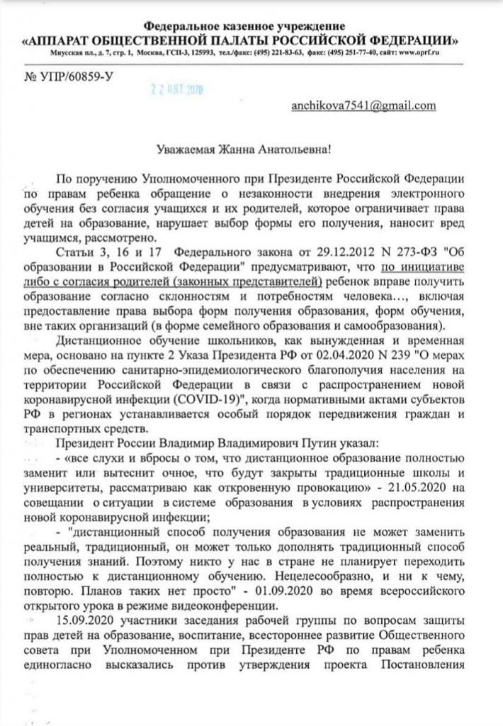 В соответствии со ст. 63 Семейного кодекса РФ родители несут ответственность за воспитание и образование своих детей. Родители обязаны заботиться о здоровье, о физическом, психическом, духовном и нравственном развитии своих детей. В силу ст.64 Семейного кодекса РФ, именно родители выступают в защиту прав и интересов своих детей. Согласно ч.1 ст.41 Конституции РФ каждый имеет право на охрану здоровья. Частью 3 указанной статьи Конституции РФ предусмотрено недопущение сокрытия должностными лицами фактов и обстоятельств, создающий угрозу для жизни и здоровья людей и предусмотрено наступление ответственности за совершение за сокрытие указанных фактов. В частности, ответственность за сокрытие информации об обстоятельствах, создающих опасность для жизни и здоровья людей предусмотрена ст. 237 УК РФ. Кроме того, частью 9 ст. 13 Федерального закона "Об образовании" установлен прямой запрет на использование методов и средств при реализации образовательных программ наносящих вред физическому и психическому здоровью обучающихся. Из приведенного выше исследования НИИ гигиены и здоровья детей и подростков вред от дистанционных образовательных технологий доказан однозначно. Обращаем Ваше внимание, что данное исследование было проведено без физического осмотра принявших в нем участие детей, соответственно без участия врачей-ортопедов для оценки влияния такой формы обучения на формирование опорно-двигательного аппарата детей.