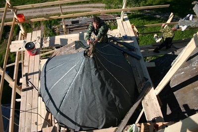 Один из наших волонтеров выучился в мастера и бесплатно делает с людьми главы в нашей московской мастерской. Полностью собирает, покрывает их лемехом. Потом это всё разбирают и увозят в Архангельскую область — всё на общественных началах. Каждая такая глава стоит 50–100 тысяч рублей. И мы на это деньги не собираем. Кто-то жертвует дерево, кто-то свой труд, всё это так кропотливо, тихонечко.