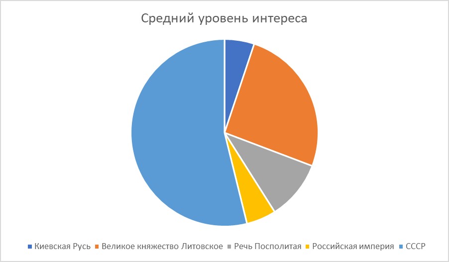 Представленные данные показательно дополнить сведениями о распределении интереса к тому или иному периоду в разрезе отдельной страны. В частности, для Беларуси средняя динамика популярности от 2004 г. по настоящее время показала, что советский период по усредненному уровню был на первом месте (21), эпоха Великого княжества Литовского (10) – на втором, а Речь Посполитая на третьем месте – 4. Киевская Русь и Российская империя с одинаковым показателем (2) поделили четвертое место. Иначе распределились средние доли уровня интереса украинских пользователей глобальной сети: советский этап украинской истории тоже занял первое место – 51, а вот на втором месте в отличие от Беларуси с высоким показателем имела Киевская Русь – 24. В хвосте с существенным отставанием в популярности оказались исторический период Российской империи (3), Великое княжество Литовское (2) и Речь Посполитая (1). Интересно, что похожая с украинским сегментом интернета диаграмма усредненного уровня интереса оказалась у запросов с российской территории. Так, советский этап русской истории занял первое место, набрав 51 пункта. Следующим по популярности периодом стала Киевская Русь, но, в отличие от украинского случая, средний показатель уровня интереса составил всего 4 единицы. Почти такой же уровень заинтересованности показал имперский период России (3). При этом внимание к Великому княжеству Литовскому и Речи Посполитой оказалось минимальным и равным 1 в каждом из случаев. Интересно, что, по всей видимости, само средневековье как таковое не пользуется «пользовательским спросом», поскольку если заменить Великое княжество Литовское на Великое княжество Московское или Русское царство, то результат окажется меньше 1.