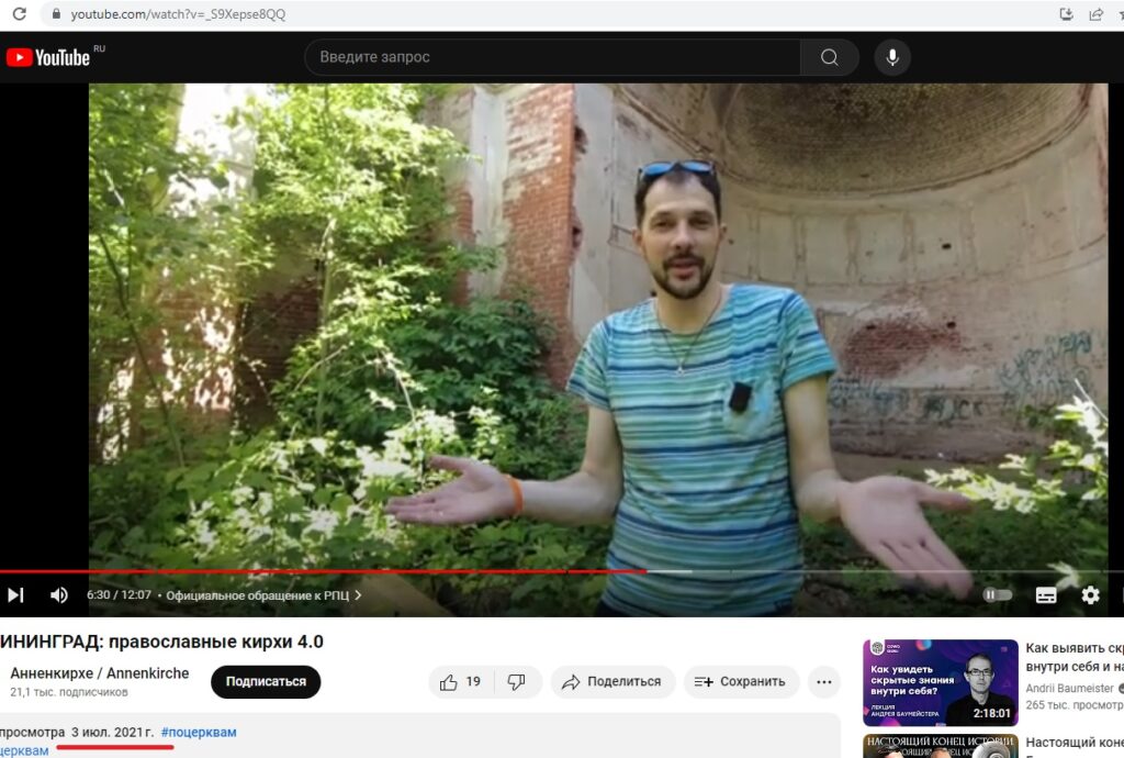 Обратите внимание на вышеуказанные скрины из ютуба. Разница между ними почти 2 года, но пастор Раскатов решил показать как было и как стало в одной из кирх после её уборки волонтёрами движения «Хранители руин».