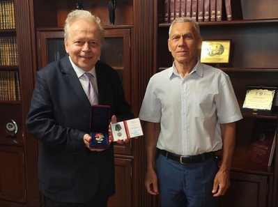 На фото: Посол России в Сербии Александр Бокан-Харченко по поручения Сергея Лаврова вручает Владимиру Кршлянину знак одной из высших наград Российского МИДа «За вклад в международное сотрудничество».
