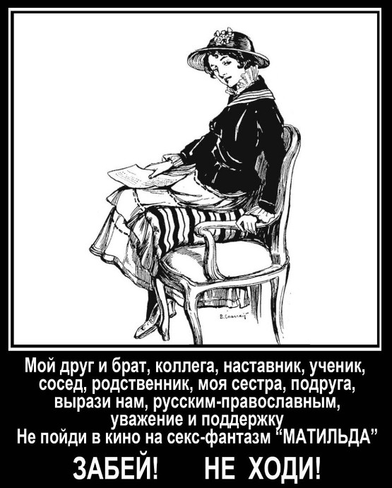 Мой друг и брат, коллега, наставник, ученик, сосед, родственник, моя сестра, подруга, вырази нам, русским православным, уважение и поддержку: не пойди в кино на секс-фантазм «Матильда»! Забей! Не ходи!