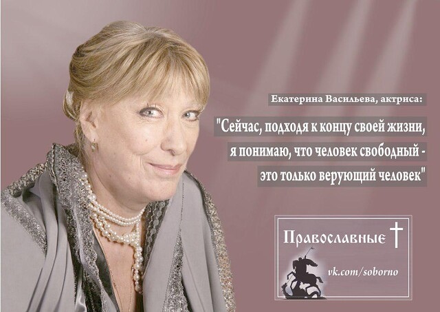 «Идите в храм! Верите – не верите – идите в храм! Выбросьте из головы все, что вам пели в уши неверующие люди, или люди, которые утверждают, что у них "Бог в душе". Не слушайте никого. Себя слушайте, прислушивайтесь к своему сердцу. Вам говорят, что христианская жизнь скучная и постная? Уверяю вас, она живая и счастливая. У нас каждый день праздник! Как то звонит мне знакомая: "Ну видела я вашу Пасху. Что же в ней такого веселого?" А другая вышла с пасхальной службы с тихим ликованием в сердце. Потому что Пасха – это Праздник праздников и на самом деле одно сплошное ликование. Только нужно прийти в храм не с предубеждением, а с раскрытым сердцем», - пишет на странице в социальной сети народная артистка России Екатерина Васильева