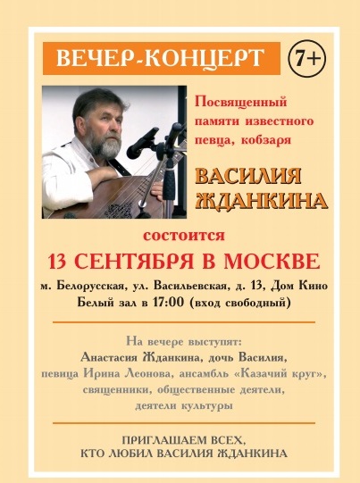 2 сентября исполнился год со дня гибели известного православного певца, барда, кобзаря Василия Жданкина. 13 сентября в Москве в Доме Кино на Васильевской улице д.13 в 17-00 часов состоится вечер памяти Василия Жданкина, сообщает «Иван Чай».