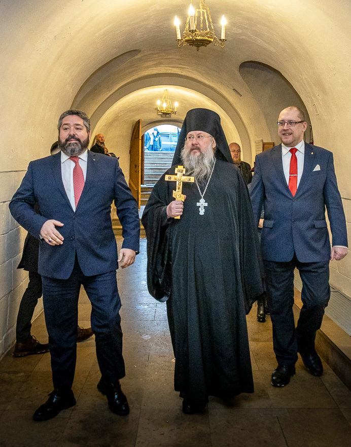 Затем состоялся праздничный ужин, на котором присутствовали государственные и общественные деятели, представители духовенства, ученые, деятели культуры, в том числе руководитель Европейского института развития демократии и сотрудничества Н.А. Нарочницкая, Президент Международной Славянской академии наук, образования, искусств и культуры (МСА) С.Н. Бабурин, б. заместитель Председателя Совета Федерации и заместитель Председателя Банка России А.П. Торшин, депутат Государственной Думы В.А. Крупенников, Председатель экспертного совета по церковному искусству, архитектуре и реставрации Русской Православной Церкви протоиерей Л.Д. Калинин, ученый-экономист В.Ю. Катасонов, князь З.М. Чавчавадзе с супругой Е.Н. Чавчавадзе, внук Короля Египта Фарука М.П. Орлов, представитель Кавалерской Думы Императорского Военного Ордена Святителя Николая Чудотворца В.А. Дворянков, директор Государственного военно-исторического музея-заповедника «Бородинское поле» И.В. Корнеев, Генеральный директор Бельгийско-Люксембургской Торговой Палаты в России О.Б. Прозоров и другие.