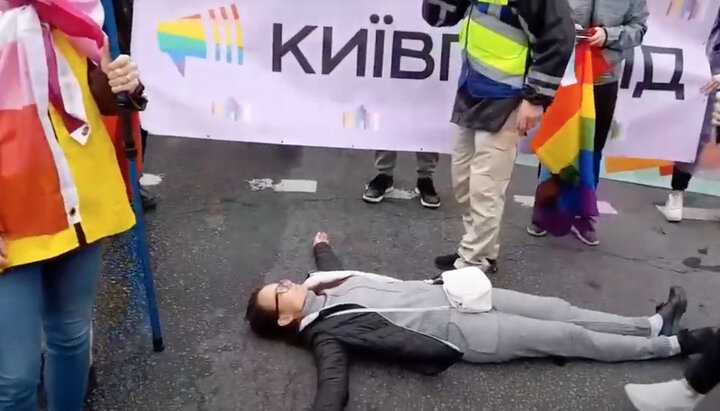 Женщина легла на землю перед участниками ЛГБТ-марша, из-за чего движение было временно приостановлено. Позже к ней подошли правоохранители, которые в итоге оттуда ее вывели.