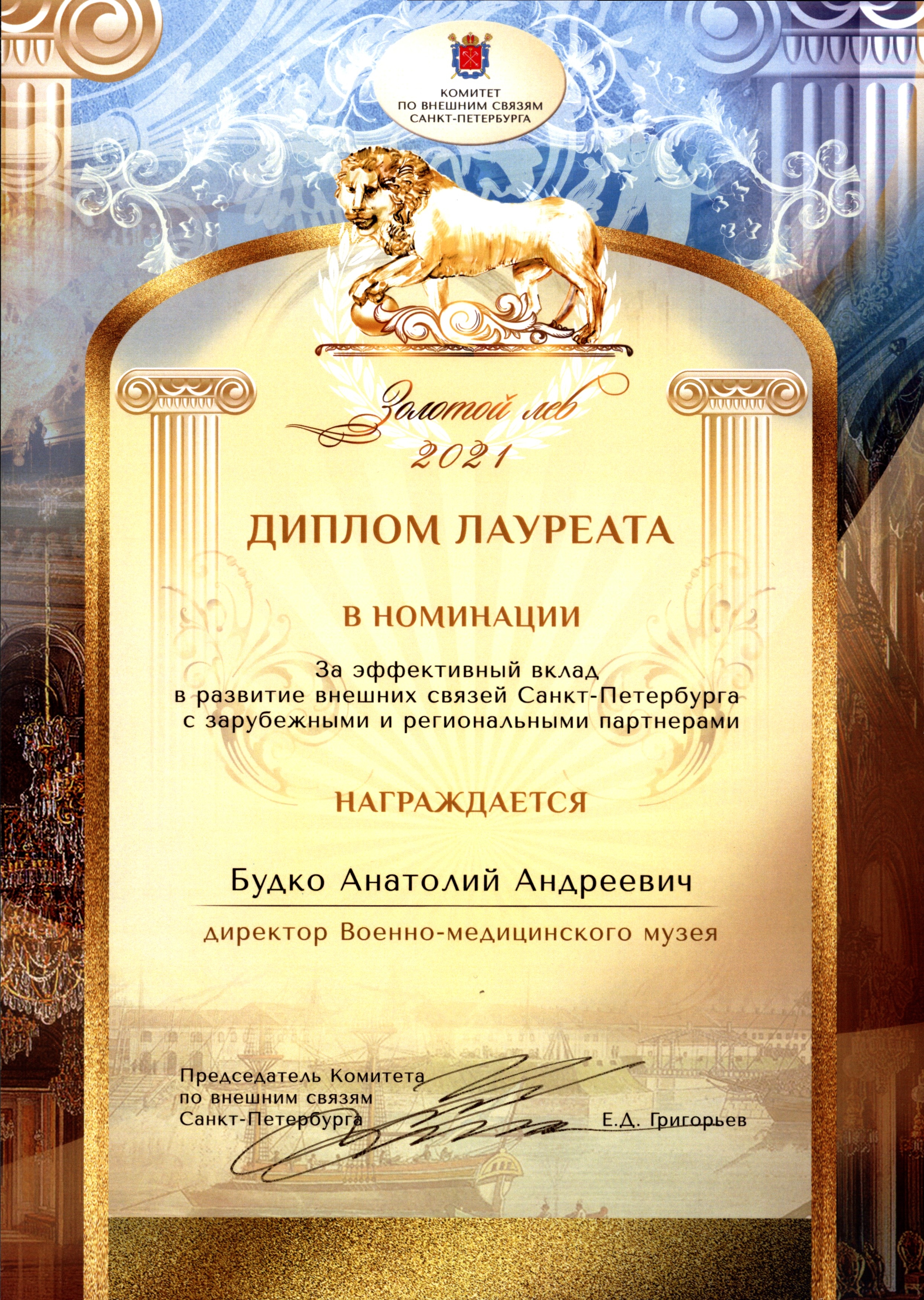 В четверг, 9 декабря Военно-медицинский музей стал лауреатом премии «Золотой лев» в номинации «За эффективный вклад в развитие внешних связей Санкт-Петербурга с зарубежными и региональными партнерами». Награду от Комитета по внешним связям Санкт-Петербурга получил директор музея Анатолий Андреевич Будко, сообщается в информационном письме редакции РНЛ.