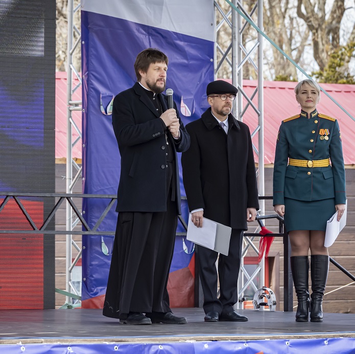 Обращаясь к собравшимся, заместитель председателя Общественной Палаты Сахалинской области, председатель Совета Сахалинской региональной общественной организации «Братство Александра Невского» протоиерей Виктор Горбач отметил, что сейчас солдаты российской армии не просто борются с нацизмом, но и защищают русский мир, право на будущее для всех жителей нашей страны.