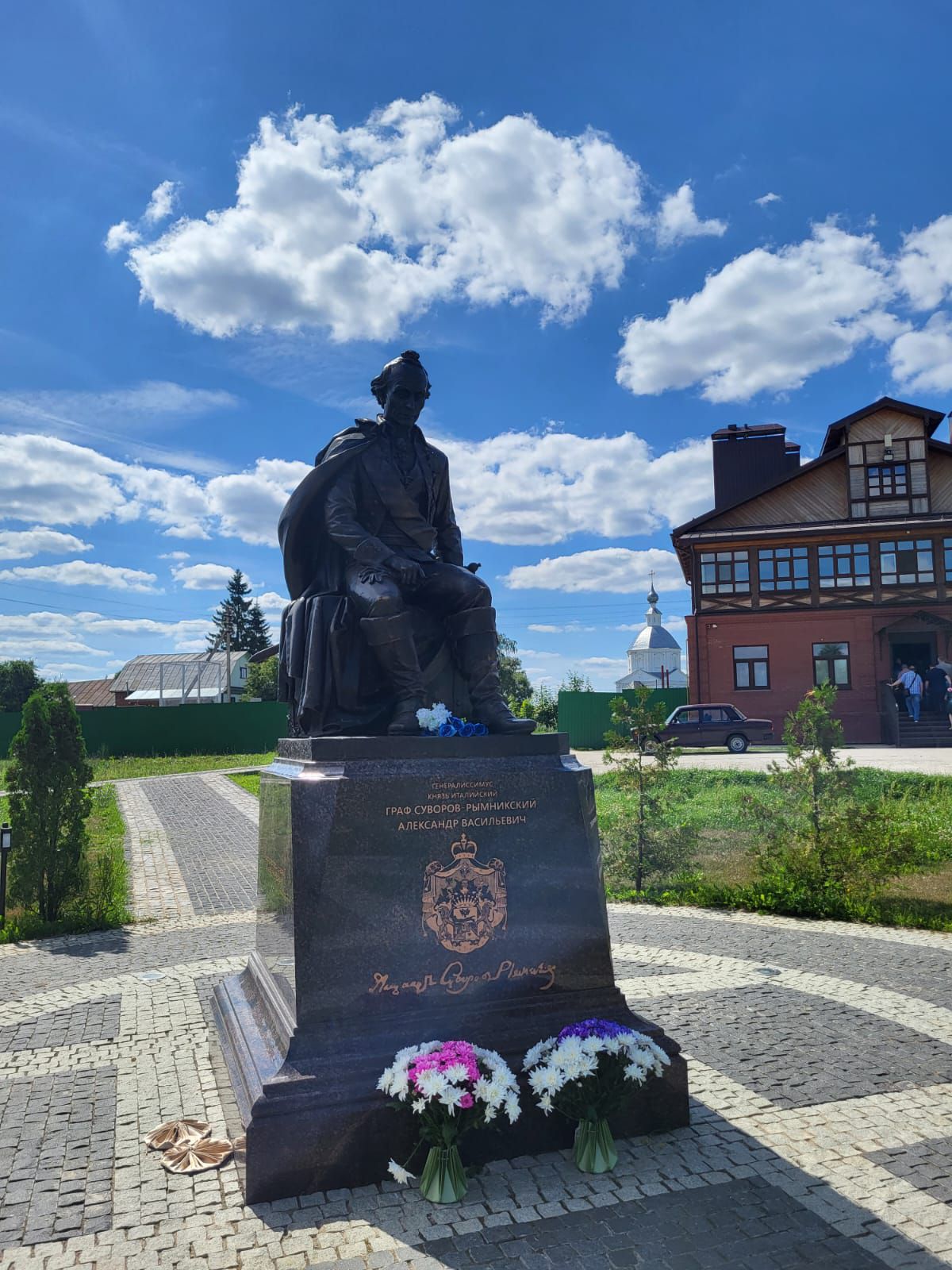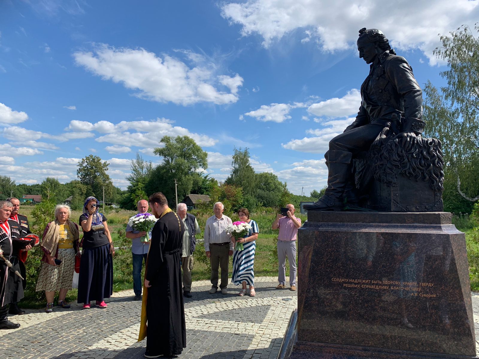 Её участники возложили цветы к памятнику селянам, погибшим в годы Великой Отечественной войны, а затем к памятнику великого сына России, непобедимого русского полководца, Генералиссимуса Александра Суворова, где сначала настоятель Суворовского Храма отец Иоанн Власов отслужил Литию, после которой к подножию памятника установили букеты цветов.