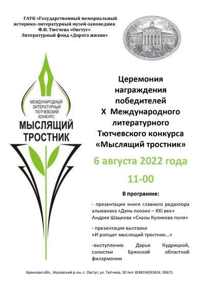 6 августа на родине поэта Ф.И. Тютчева пройдет церемония награждения победителей X Международного литературного Тютчевского конкурса «Мыслящий тростник», говорится в информационном письме, полученном редакцией РНЛ. В музее-заповеднике соберутся победители и лауреаты конкурса нынешнего года, поэты, писатели и журналисты из разных городов России.