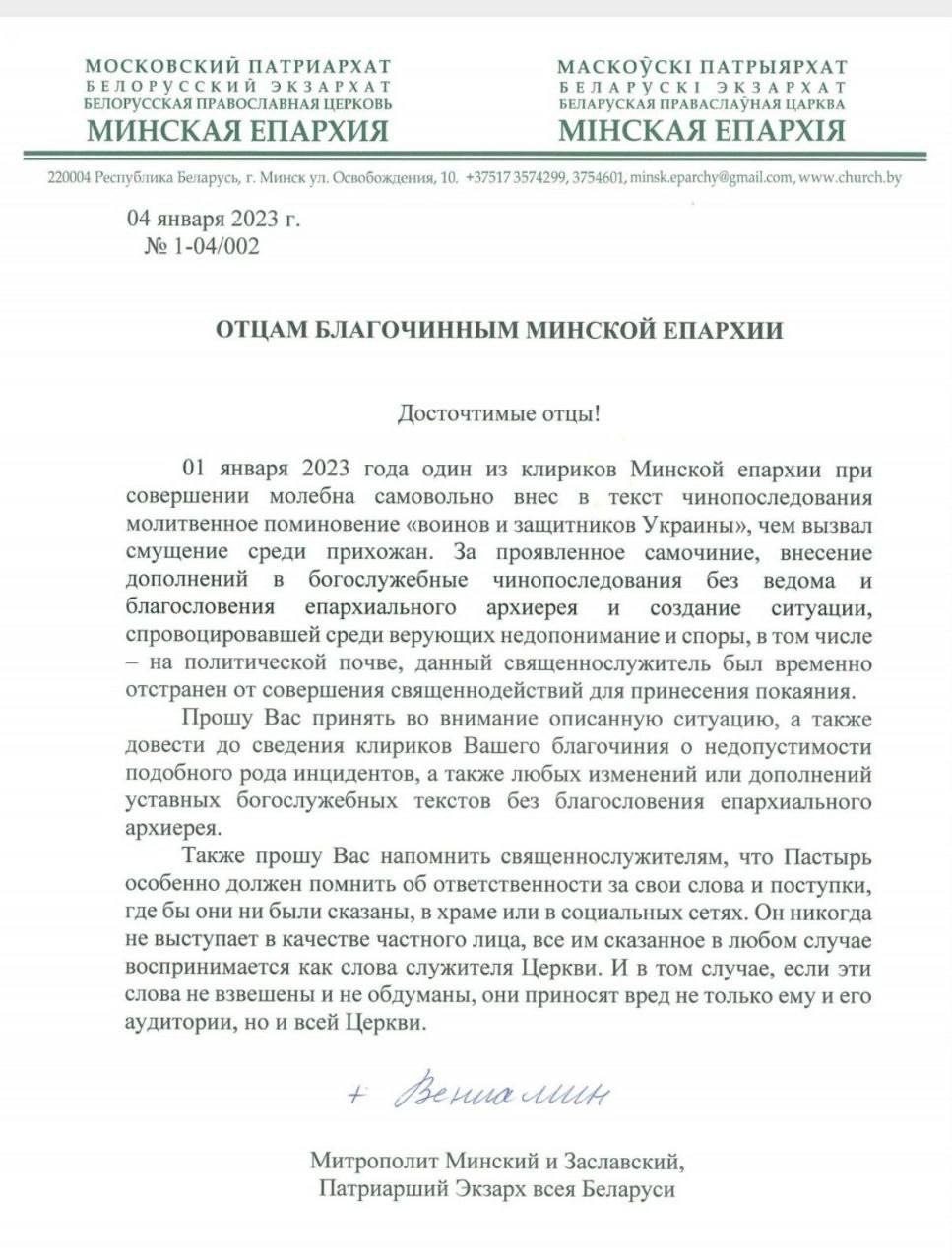Священник Дионисий Коростелев в новогоднем молебне в минском храме в честь иконы Божией Матери «Всех Скорбящих Радосте» совершил молебен о здравии «воинов и защитников Украины», сообщает сайт «Благодатный Огонь». В своем письме, датированном 4 января и разосланном благочинным Минской епархии, Митрополит Минский и Заславский Вениамин, патриарший экзарх всея Беларуси, предстоятель Белорусской православной Церкви указывает воздерживаться от подобных «инцидентов». Митрополит Вениамин отстранил священника Дионисия от совершения священнодействий для принесения покаяния. По мнению митрополита, молитвы за защитников Украины вносят соблазн в среду верующих.