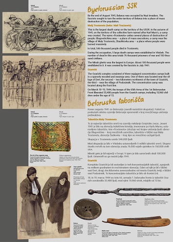 В экспозицию вошли около 100 оцифрованных материалов. Это фотографии, живопись, графика, изображения предметов из фондов Музея Победы. Зрители увидят живописные полотна художников Ильи Клейнера и Николая Осенева, графику Геннадия Доброва и Александра Цесевича, снимки найденных предметов на местах расстрелов евреев и ужасающие находки из концлагеря Майданека, фотоматериалы из экспозиции в бараке №14 комплекса «Аушвиц-Биркенау», личные карточки узников концлагерей, рабочие карточки военнопленных и т.д.