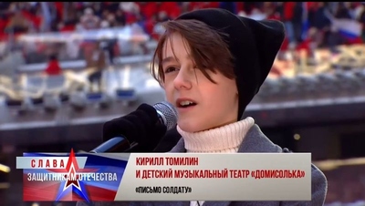 На митинге-концерте в «Лужниках», который прошел 22 февраля в преддверии Дня защитника Отечества, состоялась премьера песни «Письмо солдату». Ее исполнил 11-летний житель Подмосковья Кирилл Томилин, сообщает пресс-служба Музея Победы. Песня, музыку для которой написал сам юный артист, а слова — автор детских песен Станислав Минаков, стала победителем музыкального проекта «Главные детские песни». Его реализует Музей Победы при поддержке Президентского фонда культурных инициатив и «Детского радио».