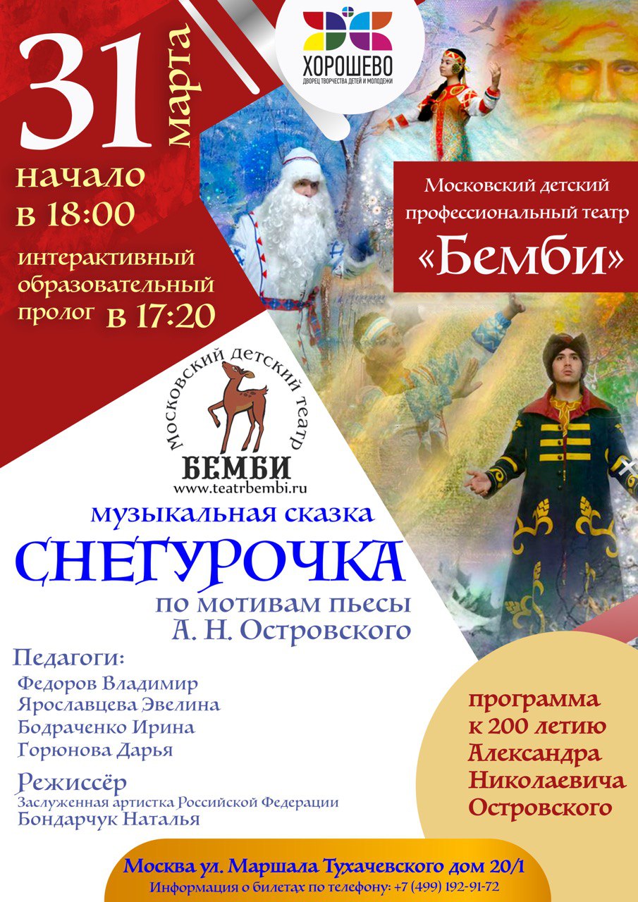 31 марта 2023 года в 18-00 во Дворце творчества детей и молодёжи «Хорошёво» (Москва, улица Маршала Тухачевского, 20/1), в рамках XXI Международного театрального форума «Золотой Витязь» состоится премьерный музыкально-драматический спектакль «Снегурочка» Московского Детского профессионального театра «Бемби» под руководством Заслуженной артистки России Н.С. Бондарчук по мотивам одноименной пьесы А.Н.Островского, поставленный к 200-летию со дня рождения выдающегося русского драматурга. И пройдёт в день его рождения по православному календарю. Перед началом спектакля, зрители также смогут посмотреть выставку детских рисунков и фотовыставку посвящённую началу съёмок фильма «Снегурочка», говорится в пресс-релизе, поступившем в редакцию РНЛ.