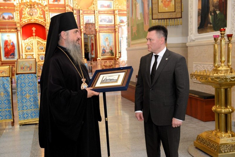 Игорь Викторович поставил свечи перед списком чудотворной Тихвинской иконы Божией Матери Иссык-Кульской, покровительницы Кыргызстана; в подарок собору преподнёс барельеф с видом храмов Московского кремля.