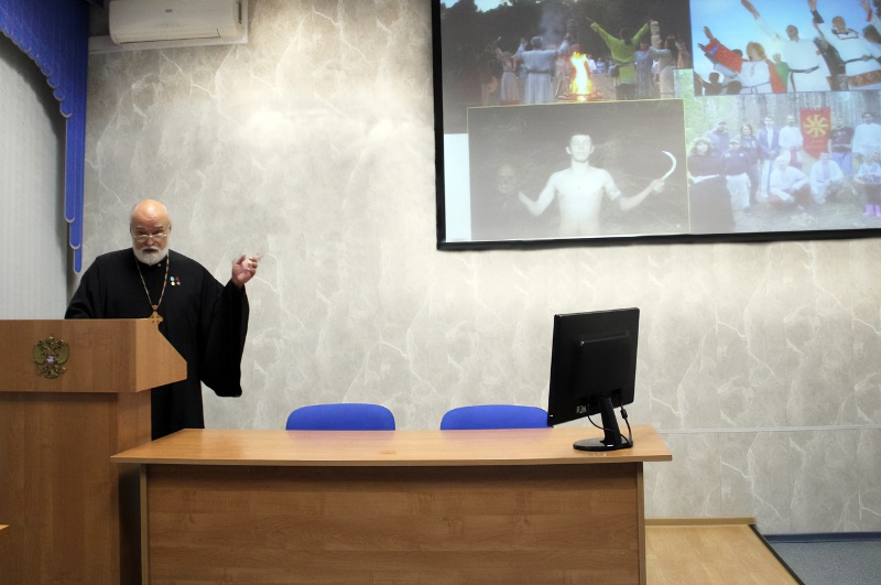 В своей лекции отец Александр рассказал о том, что из себя представляет неоязычество, об истории его возникновения и развития, и о том, какую опасность оно представляет для нашего народа и государства. В качестве примера он привёл, в частности, выдуманную Львом Силенко - штатным агентом «Абвера», сбежавшим после войны сначала в Англию, а потом в Канаду, - «РУН-веру». Эта «Родная украинская национальная вера» стала распространяться на Украине в период президентства Ющенко - именно его жена, являвшаяся агентом ЦРУ, привезла туда Льва Силенко в 2008 году. Идеология подобных сект (а их - множество и на Украине, и в России, и на всём постсоветском пространстве) агрессивна, как правило носит расистский, нацистский, и откровенно антихристианский характер. Среди адептов распространены идеи превосходства над не членами секты, идеи расчеловечивания «всех, кто не с нами». Эти экстремистские по сути идеи в дальнейшем ведут к терроризму и преступлениям на почве ненависти. Отец Александр рассказал о вовлечении в подобные секты - целевыми группами для вербовки в них являются молодёжь, сотрудники силовых ведомств, военнослужащие. И если в 90-е годы сектантские зазывалы приставали к людям на улице или ходили по домам, то сейчас вербовка переместилась в интернет, где сначала отбирают потенциально подходящих, а затем ведут с ними индивидуальную работу. В завершении лекции отец Александр рассказал о том, как распознавать попытки вербовки и о методах профилактики вовлечения родных и близких, а так же ответил на вопросы слушателей.