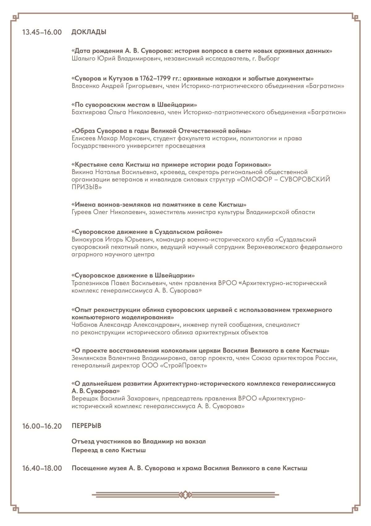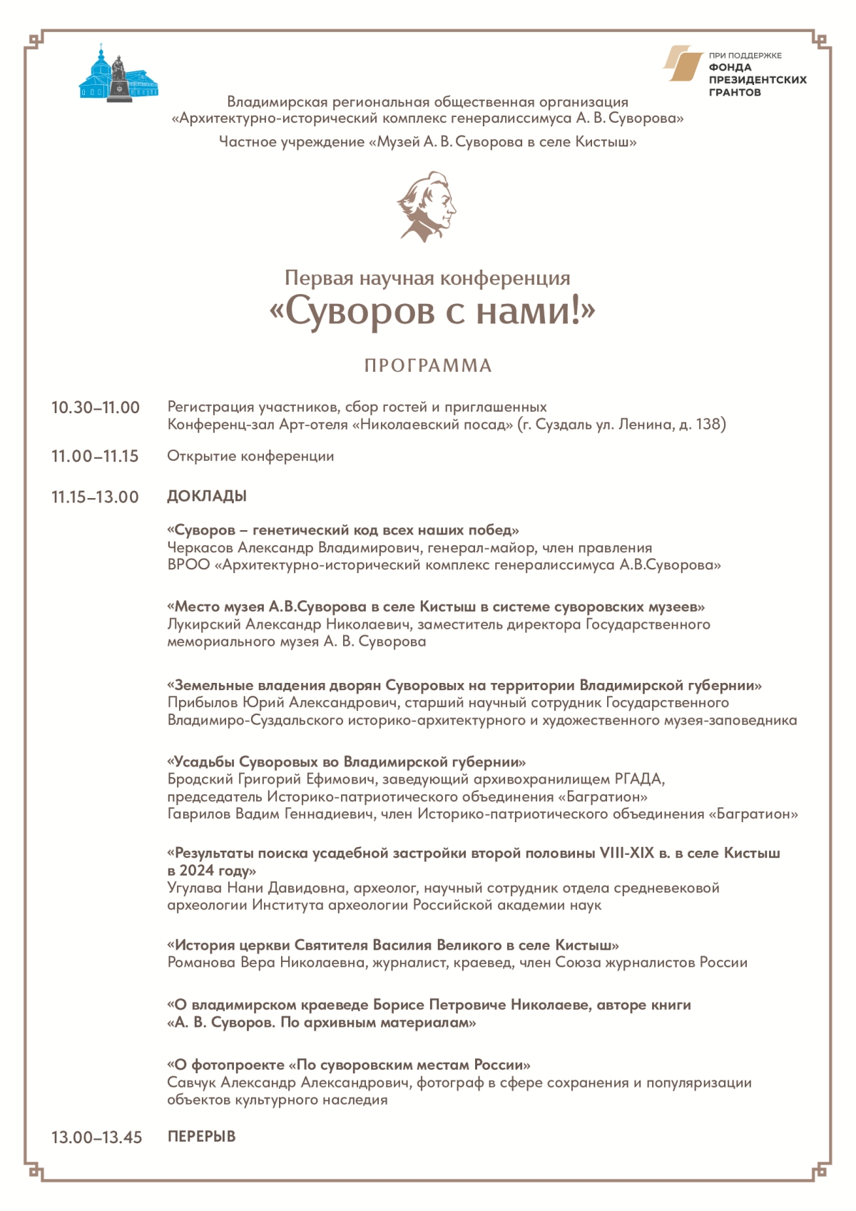 В конференции приняли участие представители госорганов, учреждений, общественных организаций из Владимира, Москвы, Санкт-Петербурга, Суздаля и др. С докладом «Суворов – генетический код всех наших побед» выступил руководитель Инициативной группы по возрождению Храма свт. Василия Великого в селе Кистыш, построенного Суворовым в память об отце Василии Ивановиче в 1780-1793гг, генерал-майор А.В.Черкасов (текст доклада см. по ссылке).