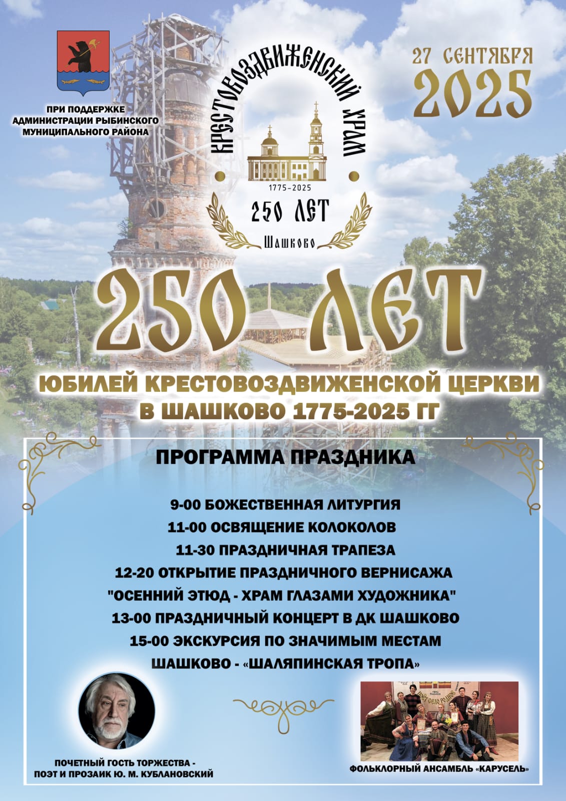 27 сентября в посёлке Шашково Рыбинской епархии состоится большой праздник, посвящённый 250-летю Крестовоздвиженской церкви, сообщили «Русской народной линии» устроители торжественных мероприятий.