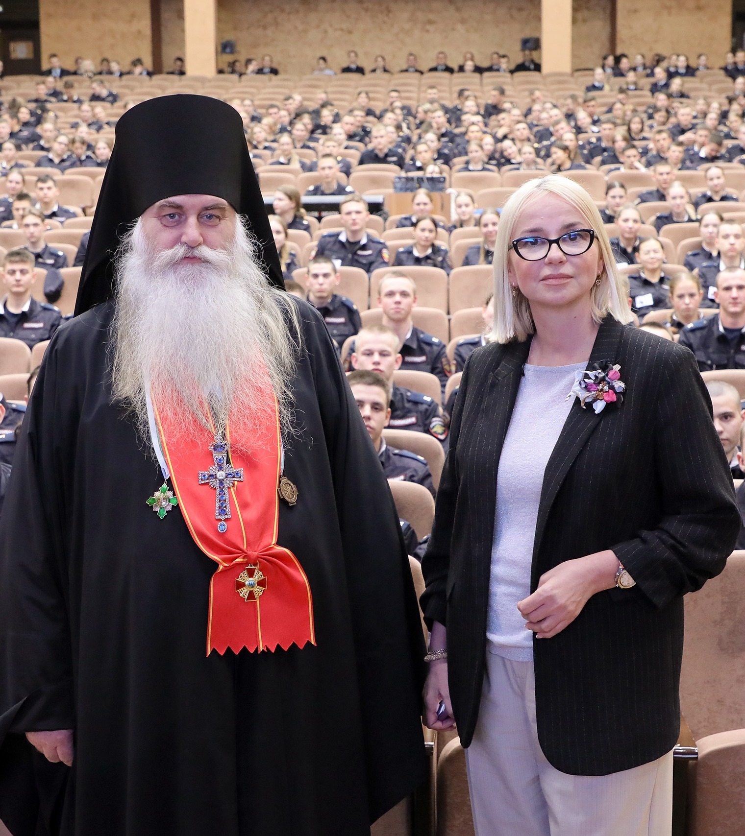 Ведущая презентации, заместитель начальника отдела морально-психологического обеспечения, начальник отделения воспитательной работы Нижегородской Академии МВД России подполковник полиции А.В.Кучинская пригласила на сцену архимандрита Тихона (Затёкина), поздравив его с днём тезоименитства - памятью Святителя Тихона, Патриарха Московского и всея России.