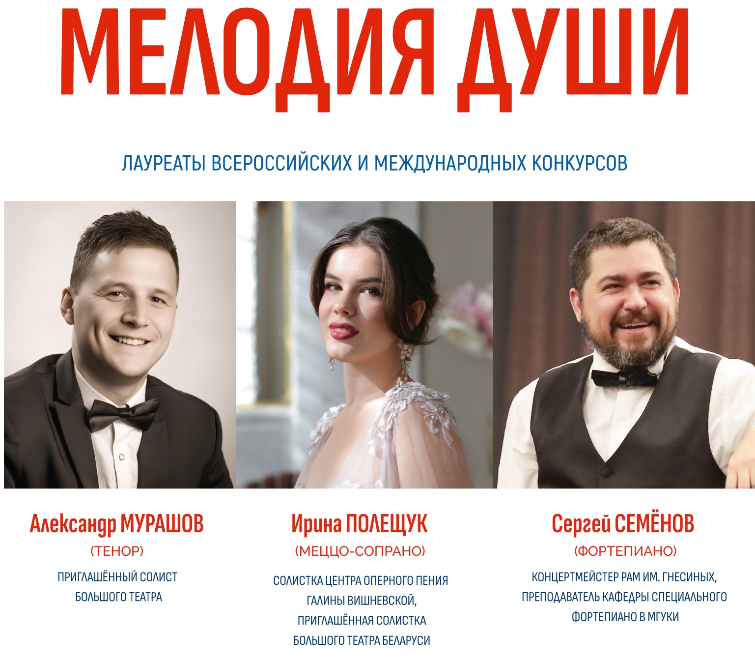 17 апреля в 17:00 в Русском Доме в Душанбе (1-ый проезд Лохути,4) для наших соотечественников и гостей, проживающих в Республике Таджикистан, пройдет концерт «Мелодия души», в котором примут участие Александр Мурашов (тенор), приглашенный солист Государственного академического Большого театра России и Ирина Полещук (меццо-сопрано), приглашенная солистка Центра оперного пения Галины Вишневской, приглашенная солистка Большого театра Беларуси. Партия фортепиано — Сергей Семенов.