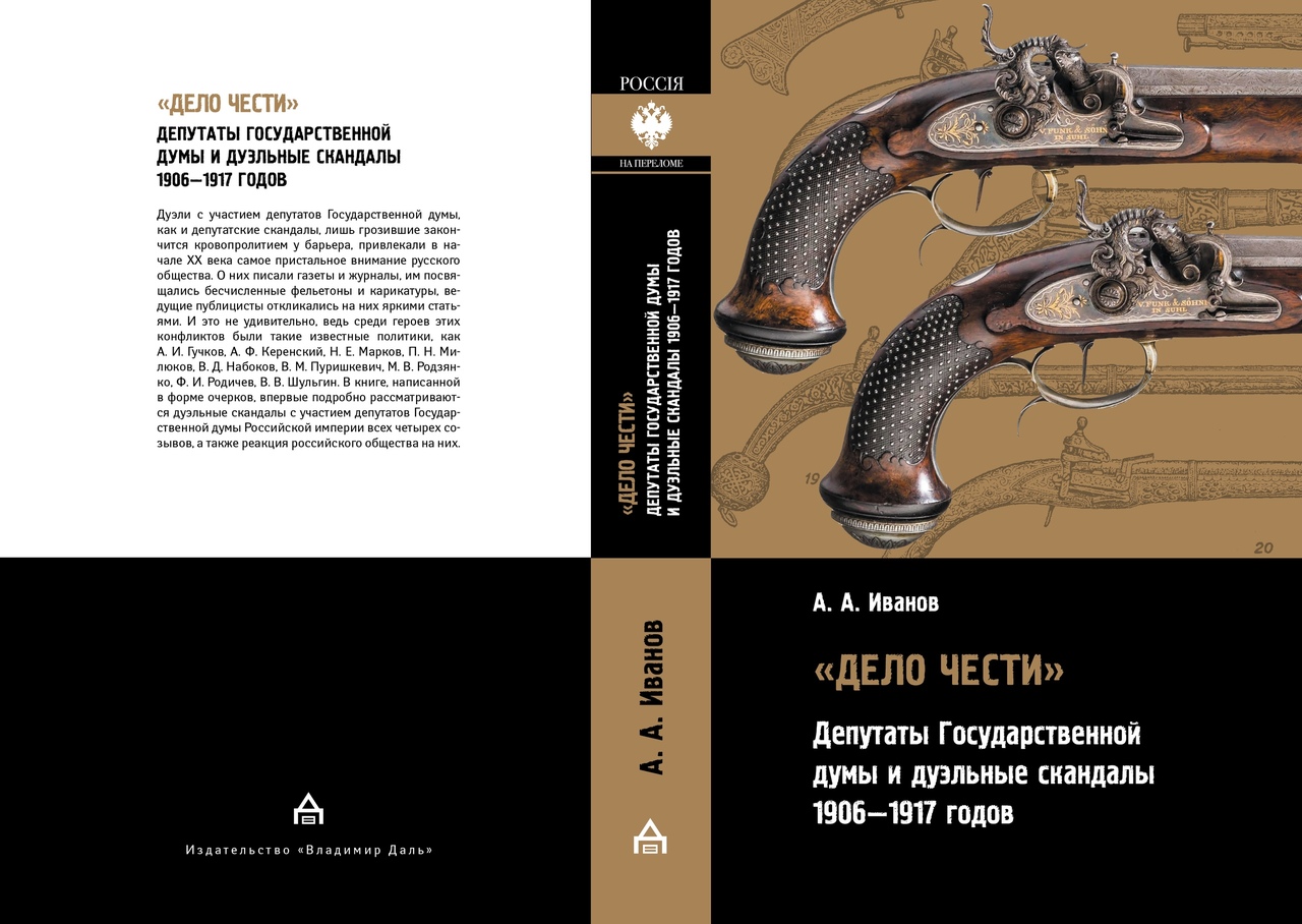 В конце августа этого года в петербургском издательстве «Владимир Даль» из печати вышла книга доктора исторических наук Андрея Иванова «"Дело чести": Депутаты Государственной думы и дуэльные скандалы (1906–1917)» (634 с.). В новой работе петербургского историка впервые в отечественной и зарубежной историографии исследуются дуэльные скандалы, участниками которых стали депутаты Государственной думы Российской империи всех четырех созывов. Автором выявлены, изучены и проанализированы как конфликты, закончившиеся выяснением отношений у барьера, так и те, в ходе которых такая возможность лишь возникала. (Ознакомиться с содержанием книги можно по ссылке).